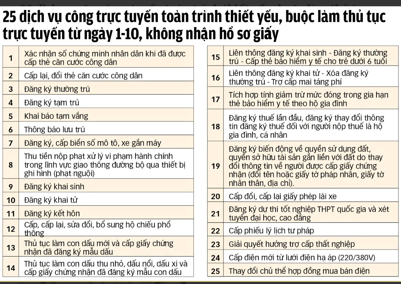 25 dịch vụ công trực tuyến toàn trình bao gồm: Xác nhận số chứng minh nhân dân khi đã được cấp thẻ căn cước công dân; Cấp lại, đổi thẻ căn cước công dân; Đăng ký thường trú; Đăng ký tạm trú; Khai báo tạm vắng; Thông báo lưu trú; Đăng ký, cấp biển số mô tô, xe gắn máy; Thu tiền nộp phạt xử lý vi phạm hành chính trong lĩnh vực giao thông đường bộ qua thiết bị ghi hình (phạt nguội); Đăng ký khai sinh; Đăng ký khai tử; Đăng ký kết hôn; Cấp, cấp lại, sửa đổi, bổ sung hộ chiếu phổ thông; Thủ tục làm con dấu mới và cấp giấy chứng nhận đăng ký mẫu dấu; Thủ tục làm con dấu thu hồi, nộp lại, đổi, cấp lại giấy chứng nhận đã đăng ký mẫu con dấu; Liên thông đăng ký khai sinh - Đăng ký thường trú - Cấp thẻ bảo hiểm y tế cho trẻ dưới 6 tuổi; Liên thông đăng ký khai tử - Xóa đăng ký thường trú - Trợ cấp mai táng phí; Tích hợp tính giảm trừ mức đóng trong gia hạn thẻ bảo hiểm y tế theo hộ gia đình; Đăng ký thế chấp lần đầu, đăng ký thay đổi thông tin đăng ký thế chấp đối với người nội thuộc là hộ gia đình, cá nhân; Đăng ký biến động về quyền sử dụng đất, quyền sở hữu tài sản gắn liền với đất do thay đổi thông tin về người được cấp chứng minh nhân dân (điều chỉnh giấy tờ pháp nhân, giấy tờ nhân thân, giấy tờ thừa kế...); Cấp đổi, cấp lại giấy phép lái xe; Đăng ký dự thi tốt nghiệp THPT quốc gia và xét tuyển đại học, cao đẳng; Cấp phiếu lý lịch tư pháp; Giải quyết hưởng trợ cấp thất nghiệp; Cấp điện mới từ lưới điện hạ áp (220/380V); Thay đổi chủ thể hợp đồng mua bán điện.